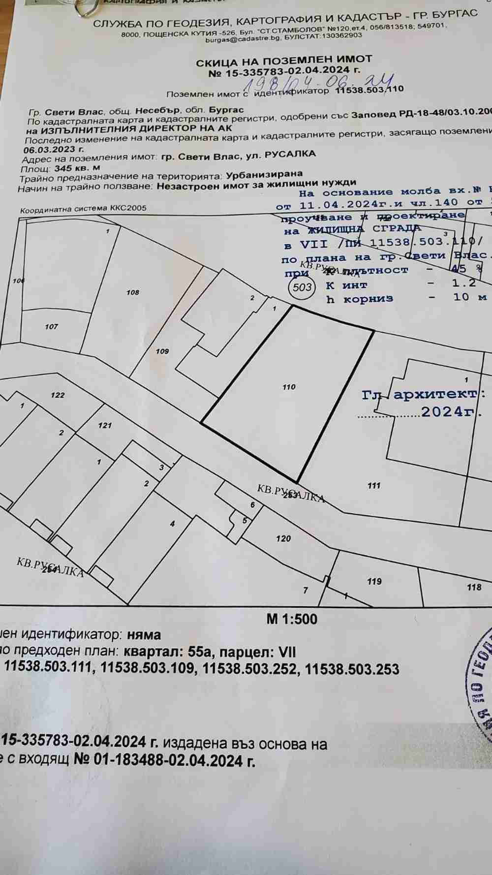 Описание: Незастроен имот за жилищни нужди в урбанизирана територия. Две лица. Виза за проучване и проектиране от 2024г. с показатели: Кпл - 45%, Кинт - 1.2, Н кота корниз -10м. Използване на денивелация. Втора линия над главната улица "Свети Власий" - срещу порт "Марина Диневи". | |